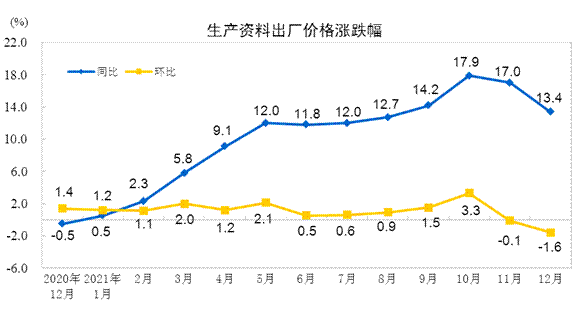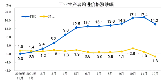 2021年12月份,全国工业生产者出厂价格同比上涨10.3%,环比下降1.2%;工业生产者购进价格同比上涨14.2%,环比下降1.3%。2021年全年,工业生产者出厂价格比上年上涨8.1%,工业生产者购进价格上涨11.0%。