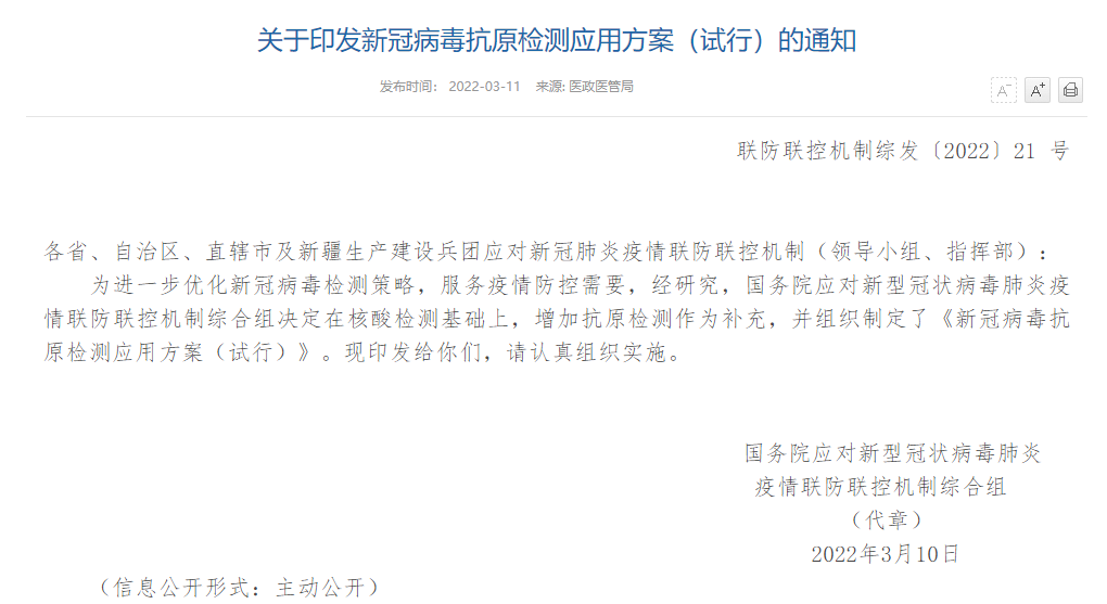 此前,国家卫生健康委员会发布通知,表示决定在核酸检测基础上,增加抗原检测作为补充,并组织制定了《新冠病毒抗原检测应用方案(试行)》。