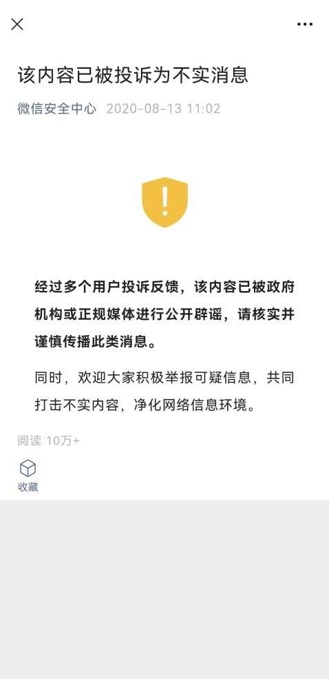 记者实测发现,从微信群转发该传言截图时,微信会有弹窗提醒:该消息被投诉为不实消息。点击了解详情后,会跳转到微信信息安全中心的微信公众号文章。