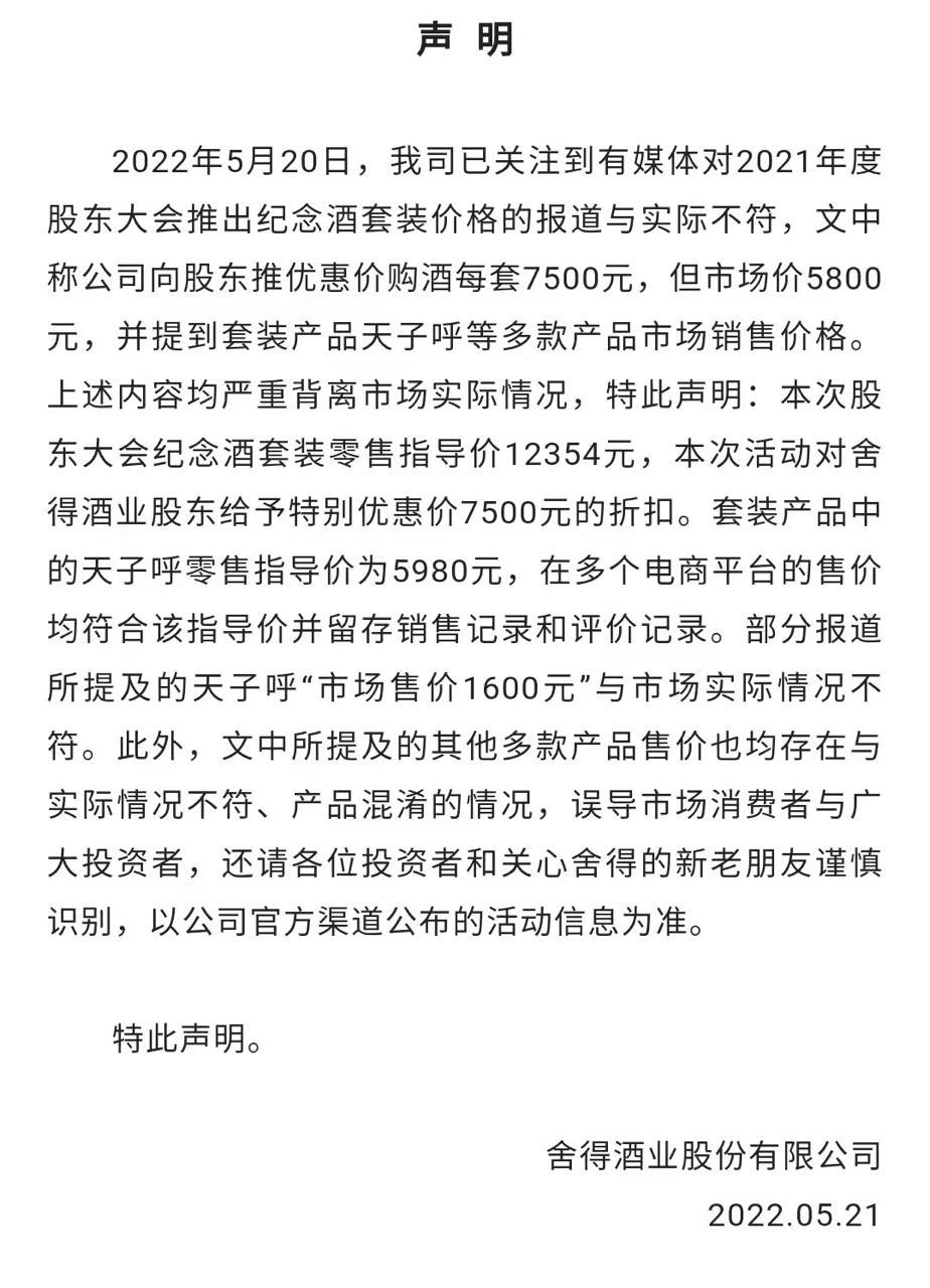 近日,舍得酒业发布声明公告称,有媒体对 2021 年度股东大会推出纪念酒套装价格的报道与实际不符。有媒体称该公司向股东推优惠价购酒 7500 元 / 套,但市场价 5800 元 / 套,并提到套装产品天子呼等多款产品市场销售价格。舍得表示,上述内容均严重背离市场实际情况。