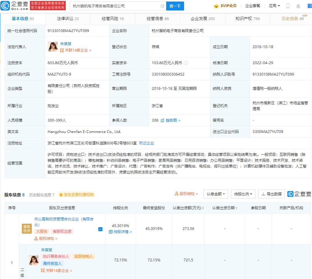 企查查信息显示,该公司成立于 2016 年 10 月,董事长、法定代表人为朱宸慧,注册资本 603.86 万元人民币,经营范围包括互联网销售、技术服务等。