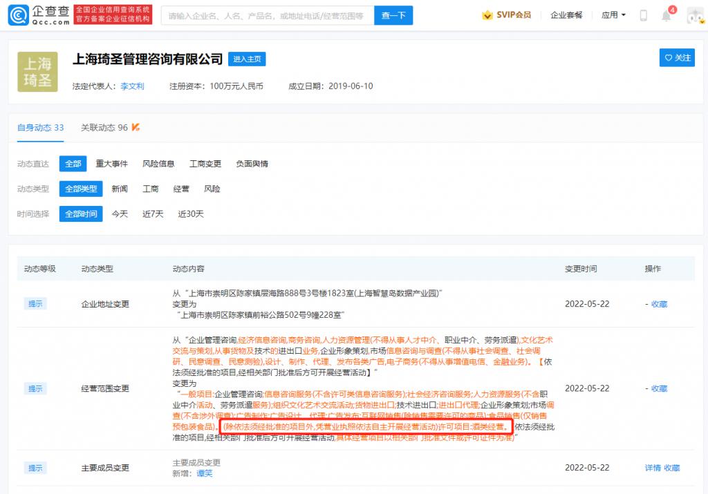 企查查 APP 显示,近日,李佳琦持股 99% 的上海琦圣管理咨询有限公司经营范围新增许可项目:酒类经营,主要人员新增谭笑。此前,李佳琦曾在直播间内带货过多款果酒。