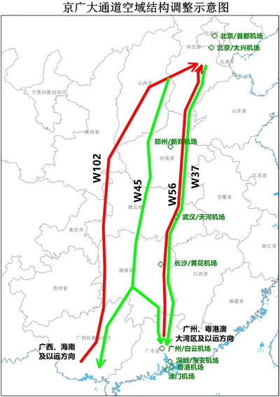 今天(5月19日)零时起,京广大通道空域结构调整方案正式启用,有效串联起北京两场、天津、郑州、武汉、长沙、广州、深圳、香港、澳门等重要区域性枢纽机场。