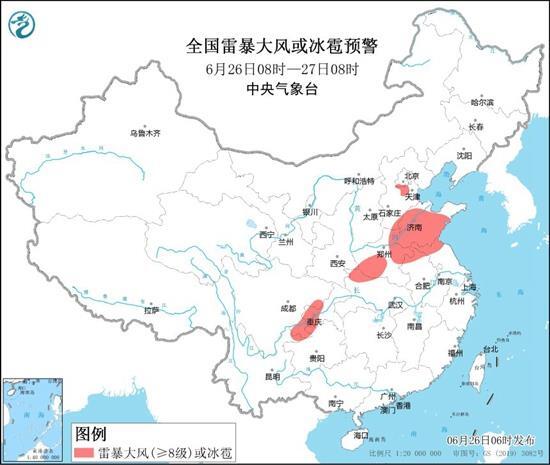预计6月26日08时至27日08时,河北中南部、北京南部、天津西南部、山东、河南东北部和西部、安徽北部、江苏北部、湖北北部、四川东南部、重庆西部等地的部分地区将有8-10级雷暴大风或冰雹天气,局地风力可达12级;内蒙古中部、辽宁东部、陕西南部、河北中南部、北京东部和南部、天津、山东、河南、安徽北部、江苏北部、湖北北部、四川东部和南部、重庆西部和北部、福建东部、广东东南部、台湾岛中部等地的部分地区将有短时强降水天气,小时雨量30-70毫米,局地可达90毫米以上。