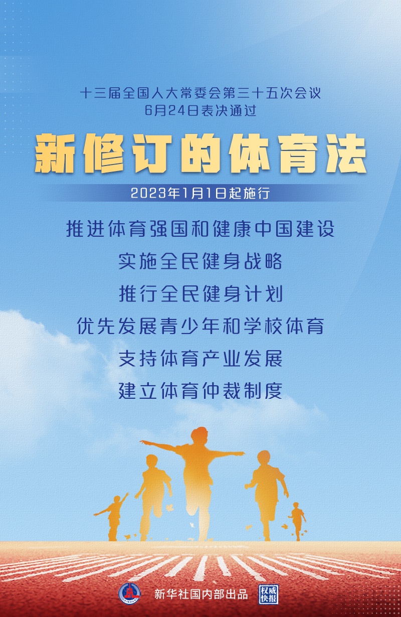 2022年6月21至24日,十三届全国人大常委会第三十五次会议审议并表决通过《体育法(修订草案)》。6月24日,《中华人民共和国体育法》经中华人民共和国主席习近平签署主席令正式颁布。