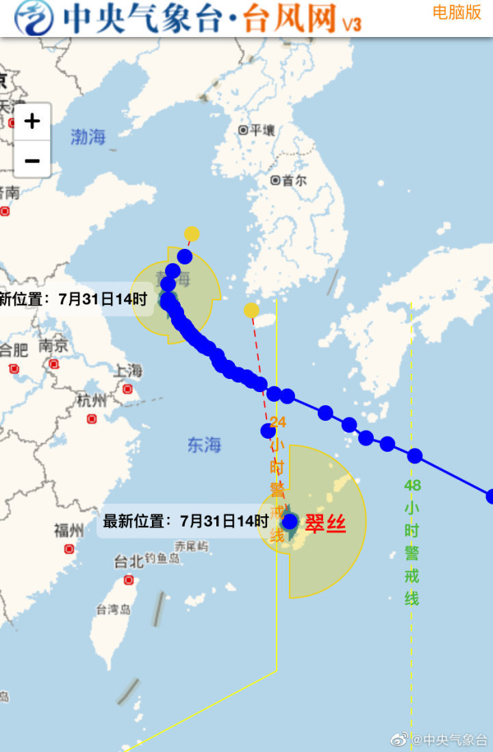 预计,“翠丝”将以每小时25-30公里的速度快速向北偏西方向移动,强度变化不大,8月1日将在黄海南部海面减弱消散。