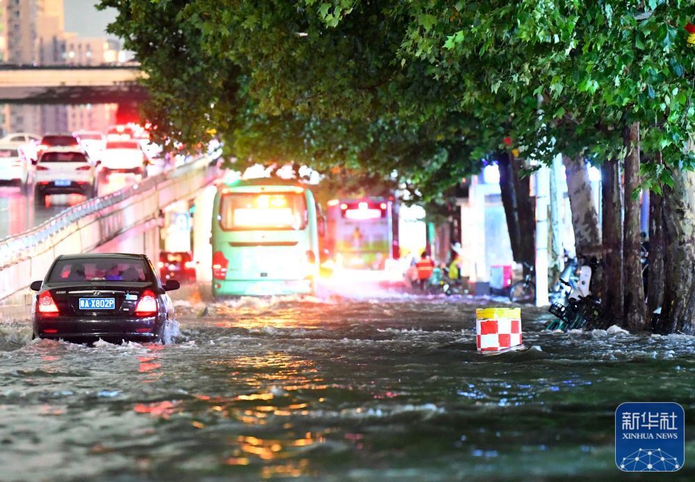 7月25日,汽车在郑州市花园路上涉水行驶。