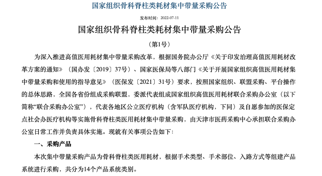 国家组织高值医用耗材联合采购办公室日前印发《国家组织骨科脊柱类耗材集中带量采购公告》,标志着第三批国家组织高值医用耗材正式启动。
