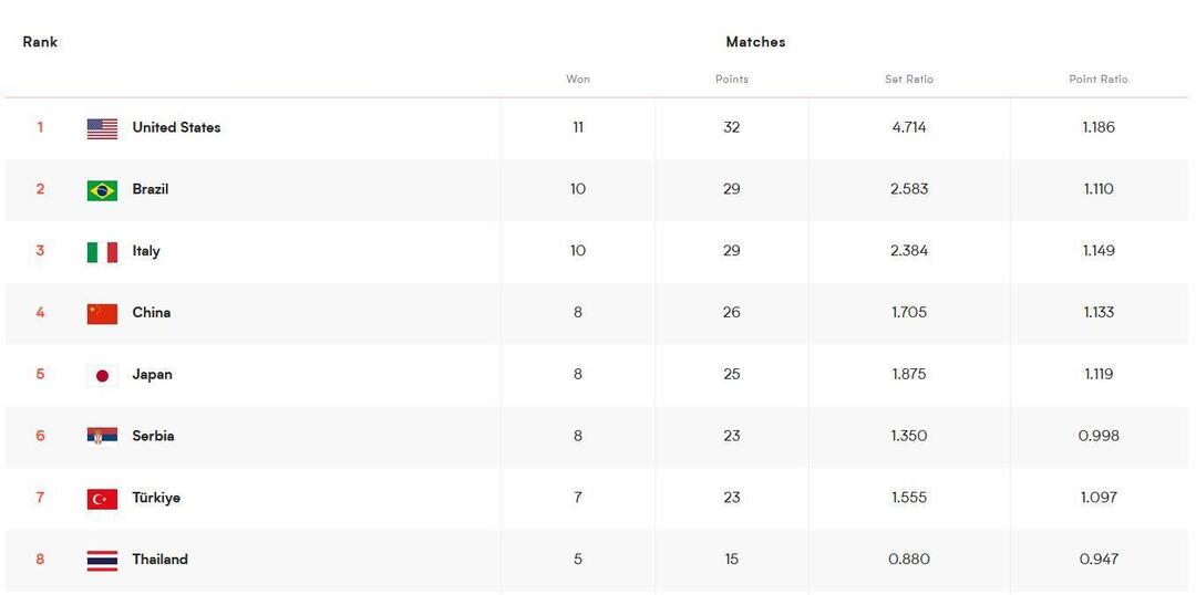 北京时间4日,2022年世界女排联赛分站赛阶段的比赛全部结束,位列积分榜前八的美国队、巴西队、意大利队、中国队、日本队、塞尔维亚队、土耳其队和泰国队获得了总决赛的参赛资格。即将到来的1/4决赛中,中国女排的对手是意大利队。