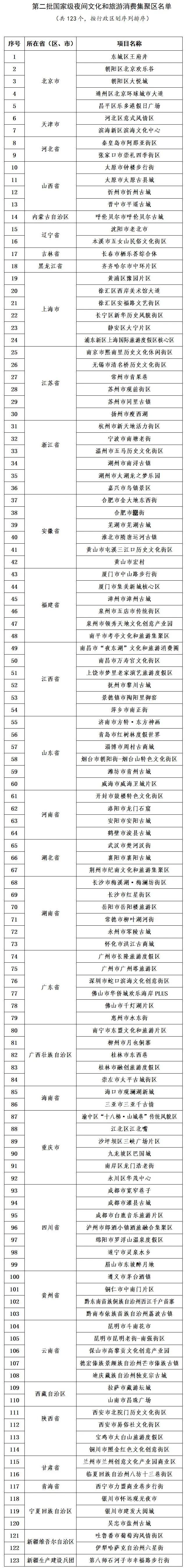 为贯彻落实《国务院办公厅关于进一步激发文化和旅游消费潜力的意见》(国办发〔2019〕41号)精神,根据《文化和旅游部办公厅关于开展第二批国家级夜间文化和旅游消费集聚区申报工作的通知》(办产业发〔2022〕27号)要求,在各地积极申报的基础上,经研究,确定第二批国家级夜间文化和旅游消费集聚区(以下简称“集聚区”)名单,现予以公布。
