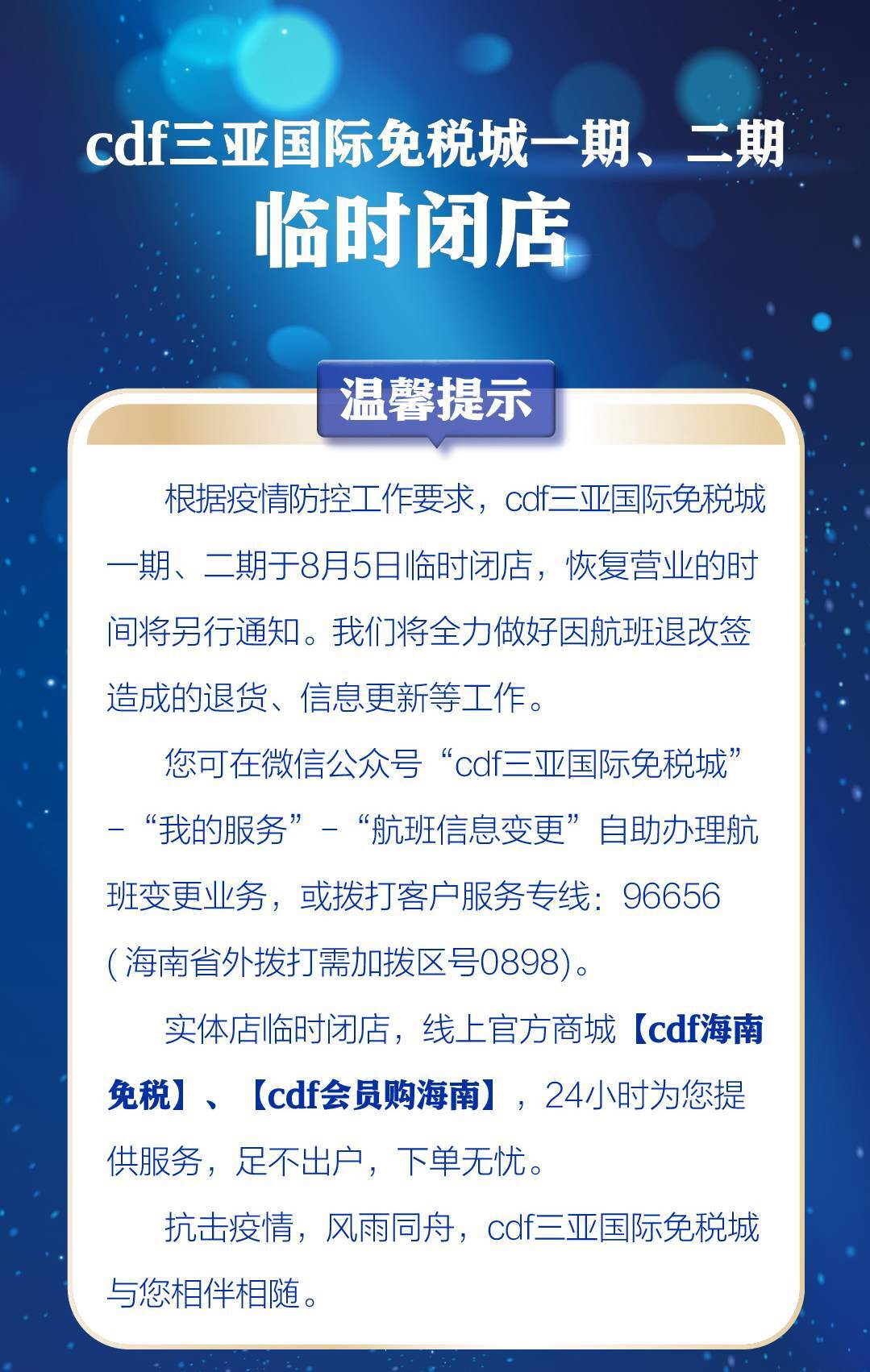 据cdf三亚国际免税城官方微信公众号消息,根据疫情防控要求,三亚国际免税城一期、二期8月5日起临时闭店,恢复营业时间将另行通知,并将做好因航班退改签造成的退货、信息更新等工作。