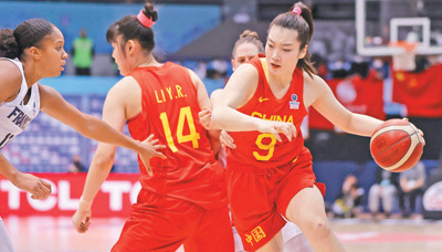 中国队在女篮世界杯预选赛比赛中三战全胜。图为中国队球员李梦(右)在战胜法国队的世预赛比赛中。普雷德拉格·米洛萨夫列维奇摄(新华社发)
