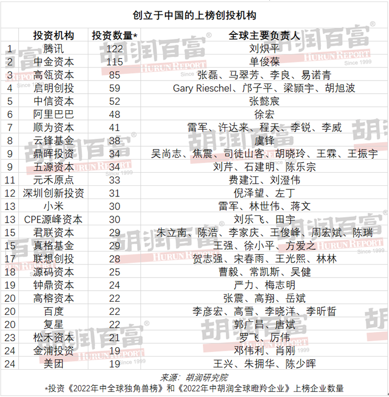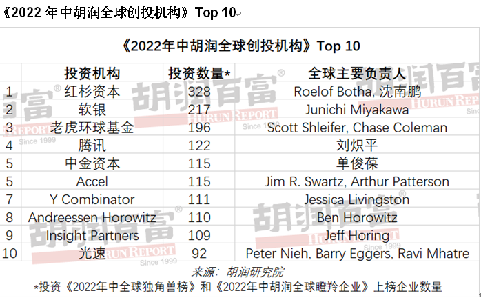 记者梳理榜单发现,此次共121家创投机构登上《2022年中胡润全球创投机构》,它们平均年龄26岁。红杉资本投资了全球328家独角兽和瞪羚企业,其投资企业包括字节跳动、远景能源等;软银投资了217家独角兽和瞪羚企业,超越老虎环球基金,跃居第二,其传奇创始人孙正义以投资初创企业而闻名,尤其是在阿里巴巴上;老虎环球基金投资了196家独角兽和瞪羚企业,排名第三,除了参与投资了抖音集团和SHEIN以外,货拉拉也是老虎环球基金比较成功的一笔投资;腾讯投资了122家独角兽和瞪羚企业,排名第四,主要关注无线互联网、新媒体、网络游戏、社交网络和电子商务领域,如微众银行、滴滴等都被大家熟知;中金资本投资了115家独角兽和瞪羚企业,排名第五,其投资了联影医疗、同心医疗等企业;Accel投资了115家独角兽和瞪羚企业,排名第五;Y Combinator(111家)、Andreessen Horowitz(110家)、Insight Partners(109家)和光速(92家)进入前十。