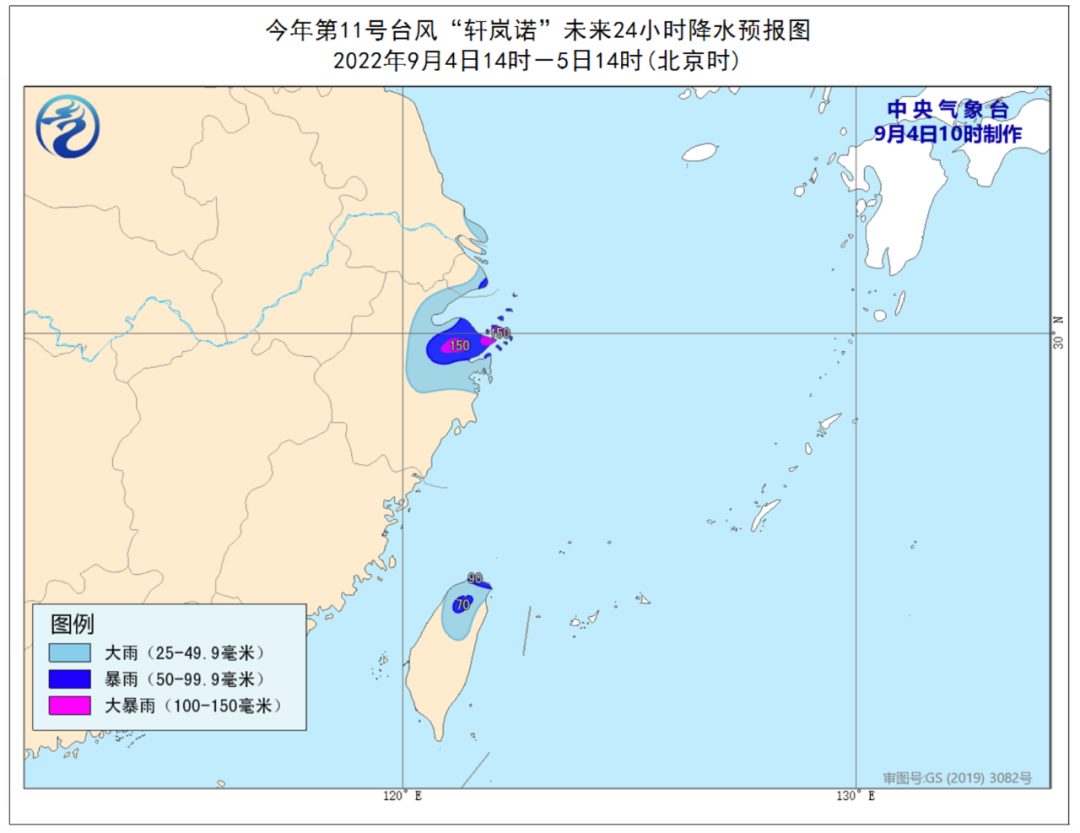 降水方面,强降雨影响主要集中在浙江东北部沿海。9月4日14时至5日14时,浙江东北部、上海和台湾岛北部有大到暴雨,其中,浙江东北部局地和沿海地区有大暴雨(100-150毫米)。