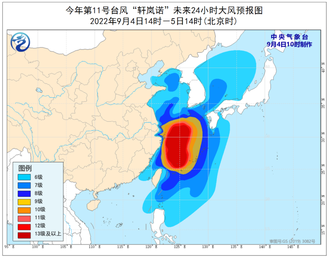 据中央气象台预报,9月4日夜间到5日早晨,“轩岚诺”将在浙江近海海面北上,5日上午开始转向东北方向移动,趋向朝鲜半岛南部到朝鲜海峡一带。