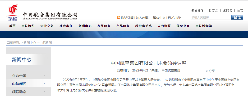 2022年9月2日下午,中国航空集团有限公司召开中层以上管理人员大会。中央组织部有关负责同志宣布了中央关于中国航空集团有限公司主要负责同志调整的决定: 马崇贤同志任中国航空集团有限公司董事长、党组书记,免去其中国航空集团有限公司总经理职务。相关职务任免按有关法律和章程的规定办理。