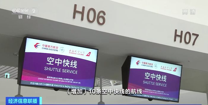 东方航空北京地面服务部业务执行部总经理 韩妮:新增了飞往海南的旅游航线,分别是大兴-三亚和大兴-博鳌,增加10条空中快线的航线。大兴-杭州也是每天加密到了8班。