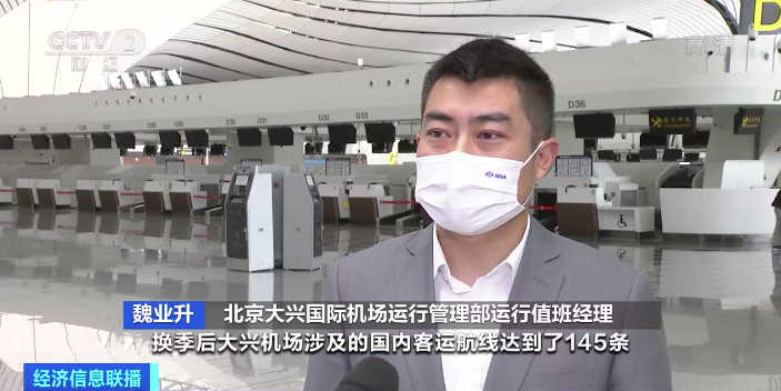 北京大兴国际机场运行管理部运行值班经理 魏业升:换季后大兴机场涉及的国内客运航线达到了145条,通航的航点139个。
