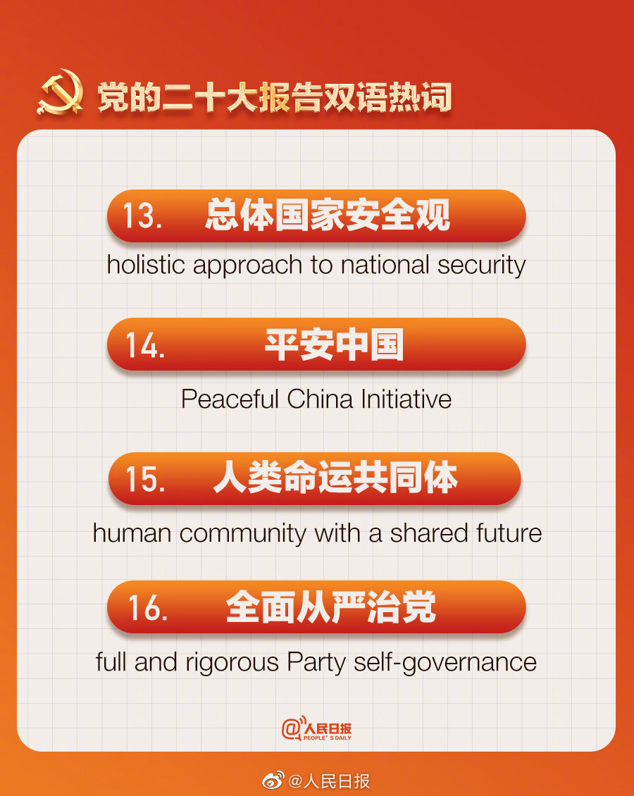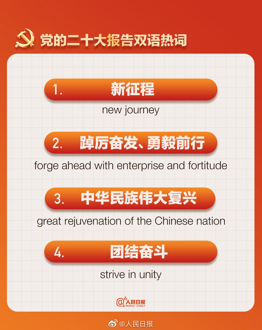 ①中国式现代化:Chinese modernization;②新征程:new journey;③第二个百年奋斗目标:the Second Centenary Goal;④人民就是江山:the people are the country;⑤人民至上:put the people first。党的二十大报告双语热词↓↓学习!