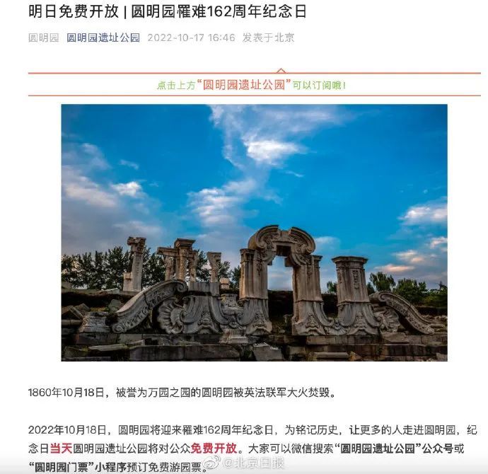 2022年10月18日,圆明园将迎来罹难162周年纪念日,为铭记历史,让更多的人走进圆明园,纪念日当天圆明园遗址公园将对公众免费开放。