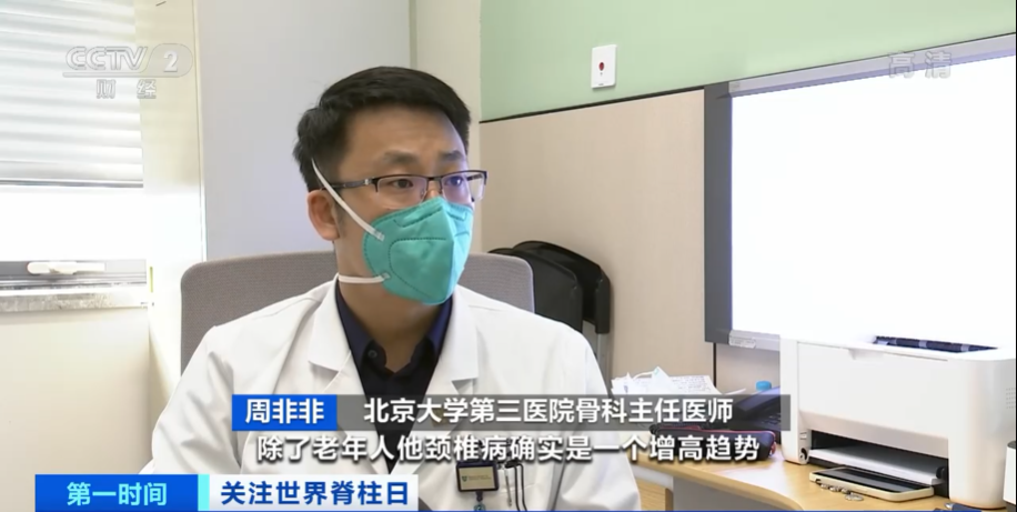 北京大学第三医院骨科主任医师 周非非:我们国家颈椎病的发病率是15%左右,老年人颈椎病发病率确实有增高的趋势,年轻化是另外一个颈椎病非常明显的特征。
