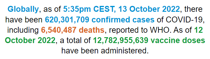 根据世卫组织最新实时统计数据,截至欧洲中部夏令时间10月13日17时35分(北京时间10月13日23时35分),全球累计新冠肺炎确诊病例620301709例,累计死亡病例6540487例。13日全球新冠肺炎确诊病例新增417329例,死亡病例新增1094例。