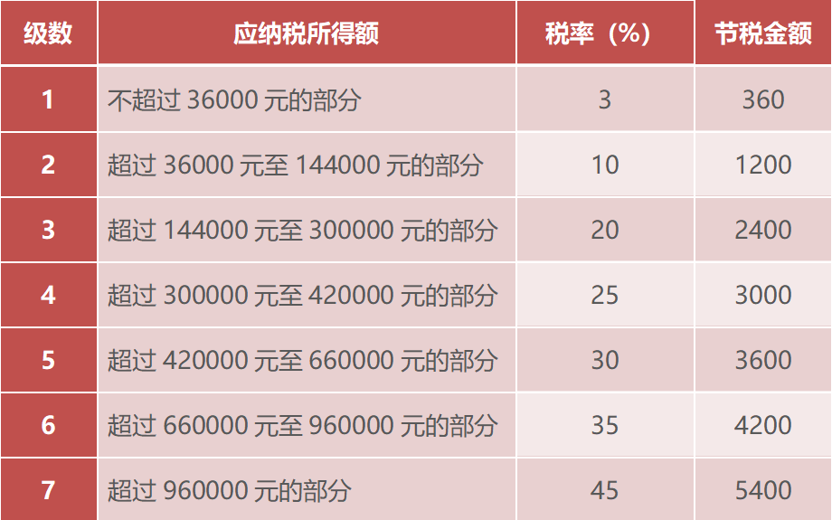 以上举例的个人收入金额适用的是20%税率,由于我国个人所得税制采取的是七级超额累计税率,针对不同收入人群,具体节税金额如下: