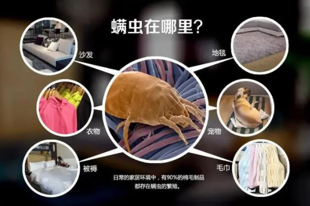 螨虫喜欢潮湿、高温、有棉麻织物和有灰土的环境,被褥是螨虫生存的主要地方。当螨虫越来越多,就会诱发过敏性鼻炎。