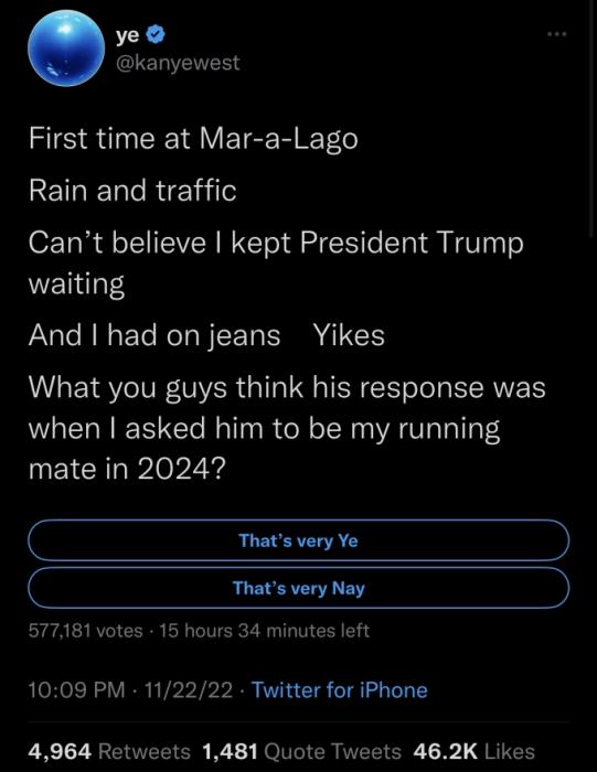 “当我邀请(特朗普)在2024年成为我的总统竞选搭档时,你们觉得他的回答是什么”侃爷问道。他还号召人们使用推特的投票功能,选择“非常赞成”或“非常反对”来投票。