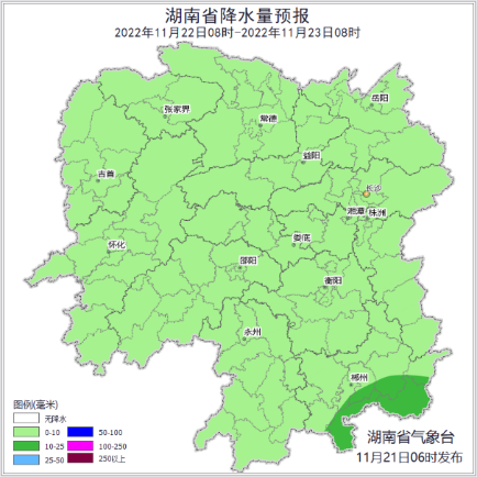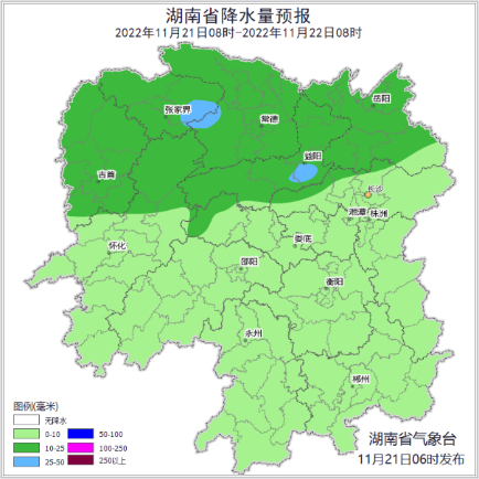 预计本周湖南将有两轮降雨过程,分别为21日至23日小到中雨过程,其中今天湘北局地有大雨;26日晚至27日,受较强冷空气影响,有一次较强降雨过程,同时气温下降明显。