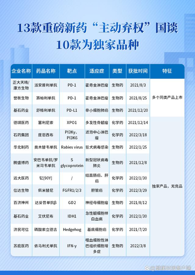 记者根据国家药监局、药企公告不完全梳理发现,在今年的医保谈判中,派安普利单抗、达妥昔单抗、佩米替尼等至少13个有资格参与医保谈判的重磅新药,并未参与此次医保谈判。作为最大的医疗服务购买方,医保向来是各大药企“必争之地”。为何有资格参与却主动“弃权”?