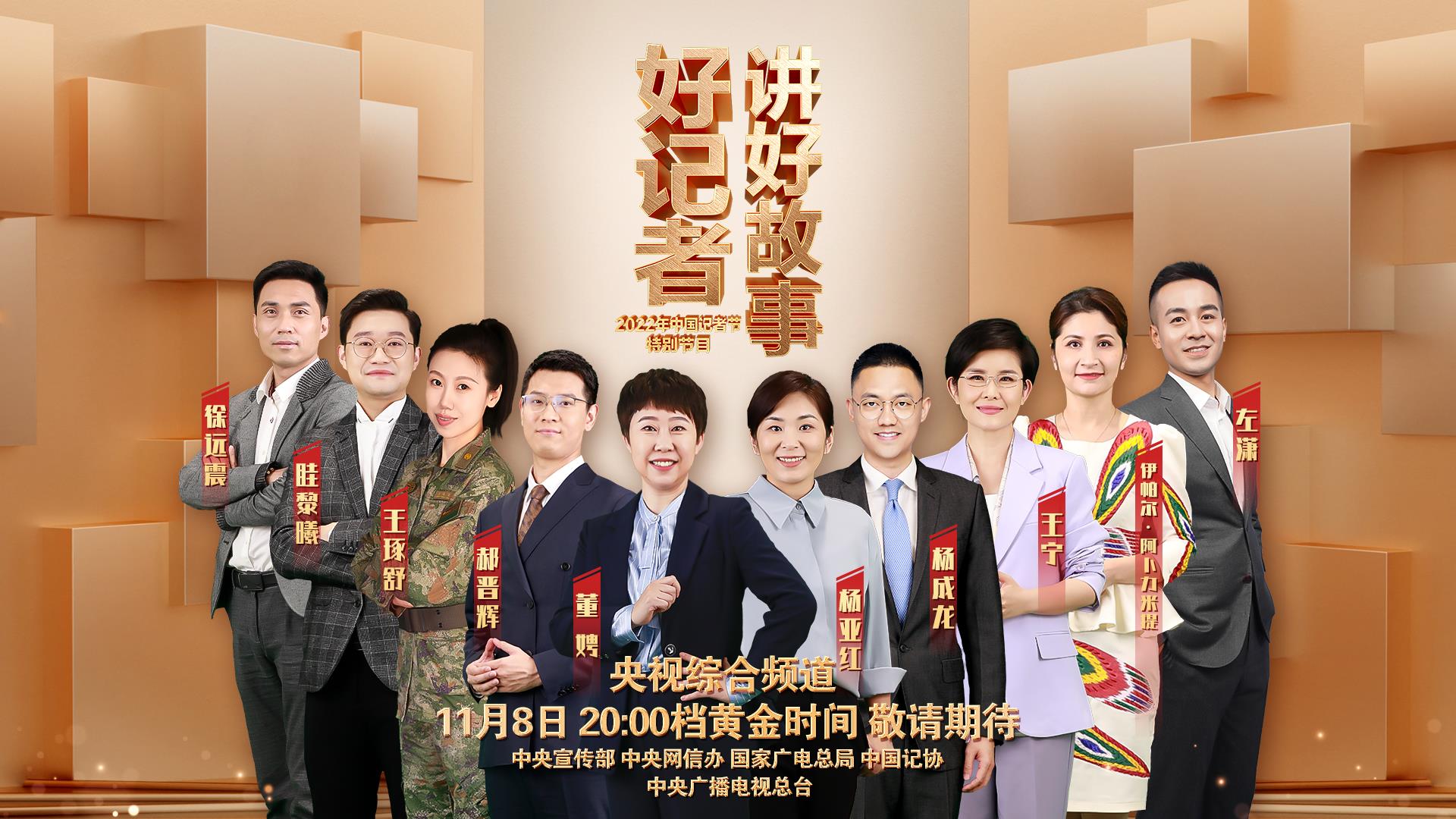 以话筒陈说事件要点,用镜头直击新闻现场。由中央宣传部、中央网信办、国家广电总局、中国记协主办,中央广播电视总台协办的《好记者讲好故事——2022年中国记者节特别节目》即将于11月8日20:00档,在央视综合频道(CCTV-1)播出。