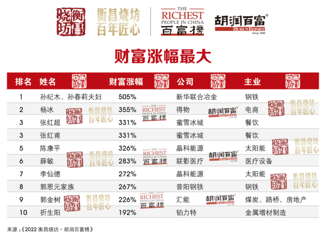 从财富增长的比例来看,今年涨幅最大的企业家主要来自钢铁和太阳能领域,其次是餐饮。