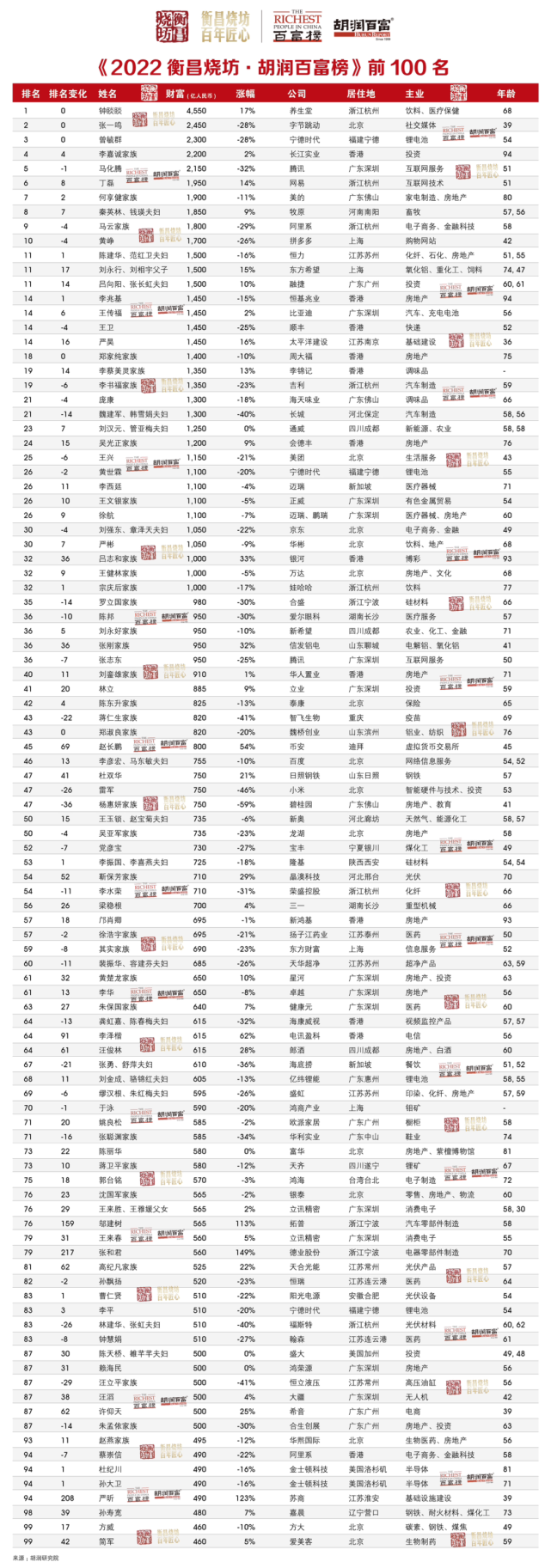 字节跳动39岁的张一鸣财富比去年下降950亿元,即28%,以2,450亿元位列第二,排名不变。宁德时代54岁的曾毓群财富比去年下降900亿元,即28%,以2,300亿元位列第三,排名不变。