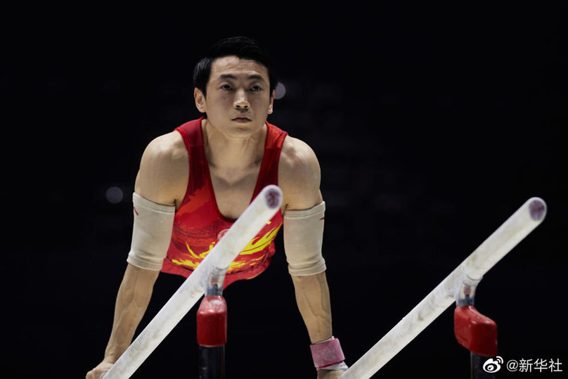 (11月6日,邹敬园在比赛中。当日,在英国利物浦举行的2022体操世锦赛男子双杠决赛中,中国选手邹敬园夺得冠军。新华社记者 李颖 摄)