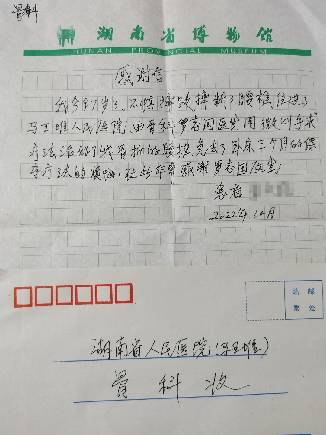 华声在线11月4日讯(全媒体记者 李传新 通讯员 吴靖 王桂香)湖南省人民医院骨科五病区近日收到一封97岁的朱奶奶写来的感谢信。她在信中写道:“微创手术治好了我骨折的腰椎,免去了卧床三个月的保守疗法的烦恼……”见字如面,老人轻松愉悦的心情跃然纸上。