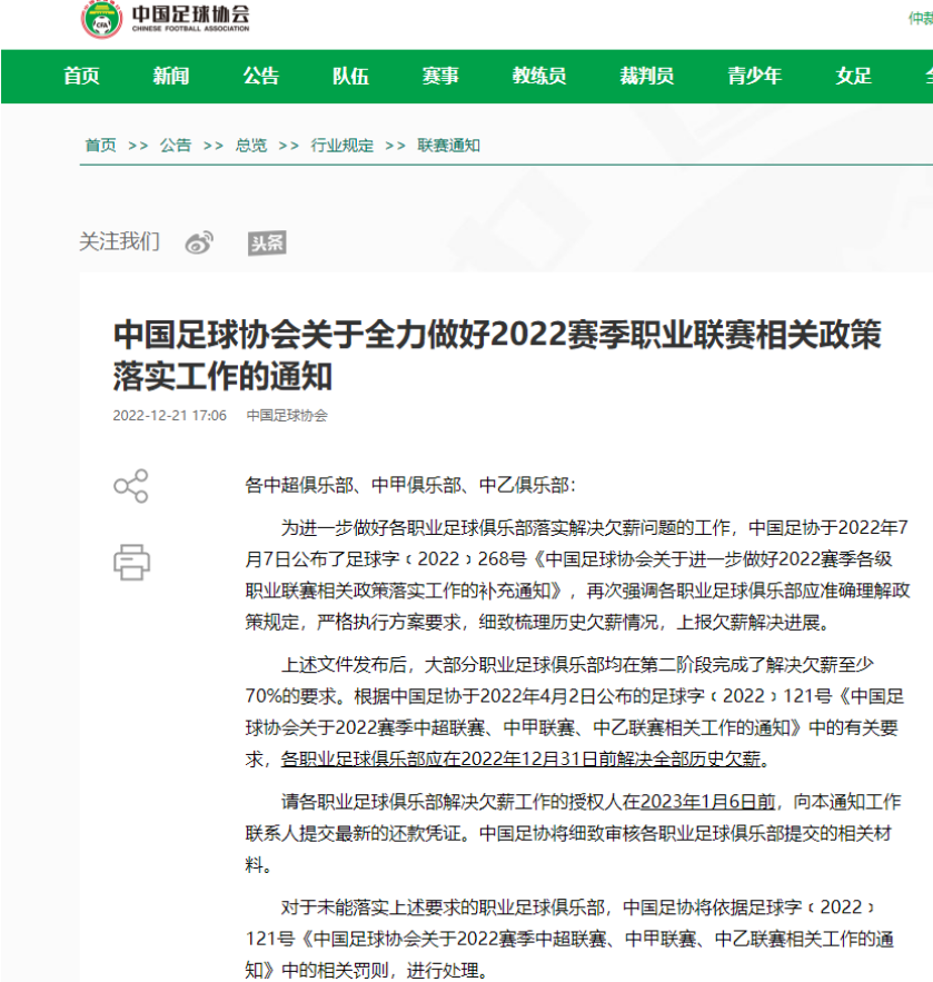 为进一步做好各职业足球俱乐部落实解决欠薪问题的工作,中国足协于2022年7月7日公布了足球字﹝2022﹞268号《中国足球协会关于进一步做好2022赛季各级职业联赛相关政策落实工作的补充通知》,再次强调各职业足球俱乐部应准确理解政策规定,严格执行方案要求,细致梳理历史欠薪情况,上报欠薪解决进展。