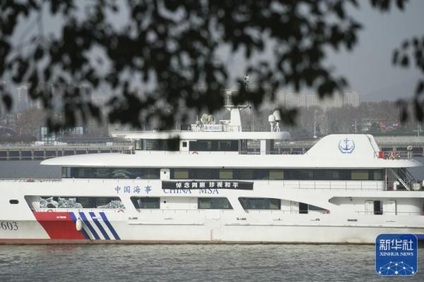 (12月13日,船只在侵华日军南京大屠杀中山码头遇难同胞纪念碑附近江面参加悼念活动。新华社记者 季春鹏 摄)