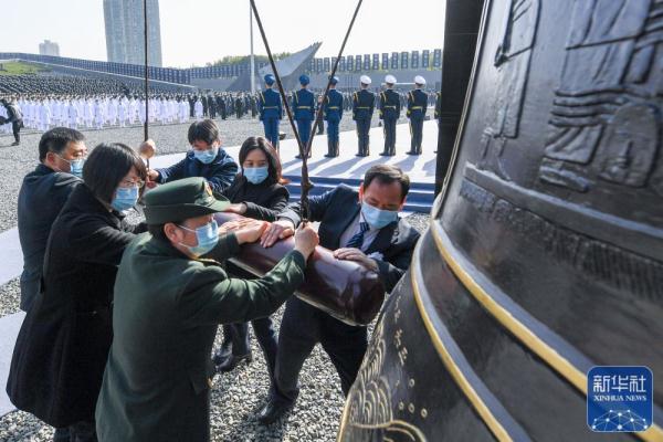 (12月13日,在南京大屠杀死难者国家公祭仪式现场,社会各界代表撞响和平大钟。新华社记者 李博 摄)
