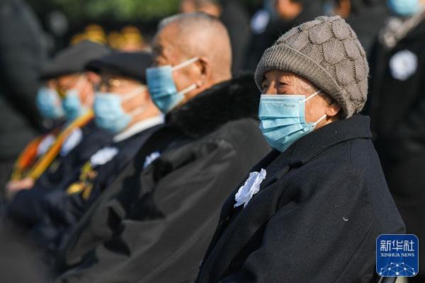 (12月13日,南京大屠杀幸存者夏淑琴(右一)和其他幸存者代表参加公祭仪式。新华社记者 李博 摄)