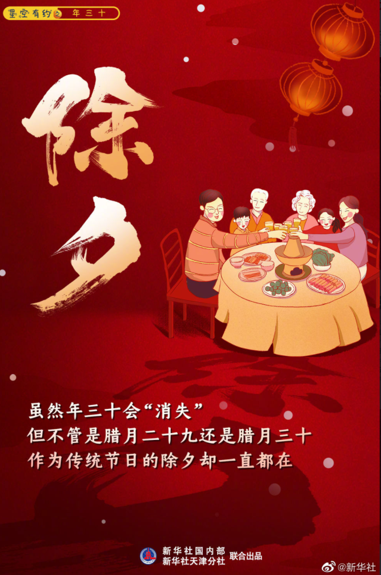 腊月逢小月的情形并不少见,2013年、2016年、2022年以及从2025年到2029年的连续5年,都没有年三十。虽然年三十会“消失”,但不管是腊月二十九还有腊月三十,作为传统节日的除夕却一直都在。