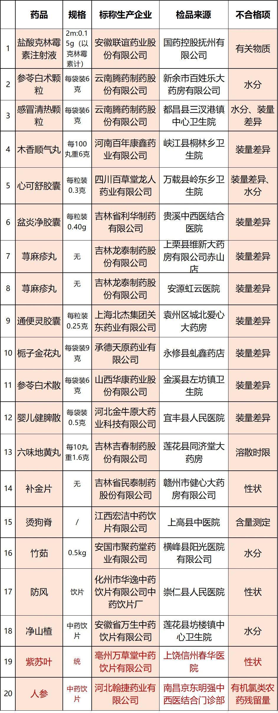 近期,江西省药品监管局组织开展药品质量监督抽检,本次共检出20批药品不合格,涉及:云南腾药制药股份有限公司生产的感冒清热颗粒和参苓白术颗粒分别检出“水分、装量差异”项目不合格;吉林龙泰制药股份有限公司生产的荨麻疹丸、上海北杰集团关东药业有限公司生产的通便灵胶囊、河北金牛原大药业科技有限公司生产的婴儿健脾散、吉林省利华制药有限公司生产的盆炎净胶囊等“装量差异”项目不合格;吉林吉春制药股份有限公司生产的六味地黄丸“容散时限”项目不合格。