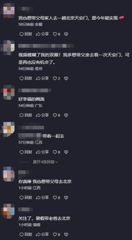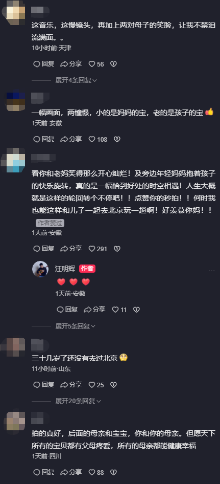 数万名网友被这则视频打动。有同为母亲的网友感慨:“看你和老妈笑得那么开心灿烂!及旁边年轻妈妈抱着孩子的快乐旋转,真的是一幅恰到好处的时空相遇!人生大概就是这样的轮回转个不停吧!!何时我也能这样和儿子一起去北京玩一趟啊!好羡慕你妈!!”有网友充满遗憾:“泪水模糊了我的双眼!我多想带父亲去看一次天安门,可是再也没有机会了。”有网友许愿:“希望今年能带着父母去一趟北京。”