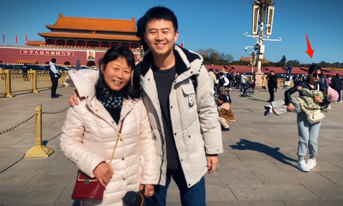 2月,汪明辉与母亲来到了北京,在天安门广场拍摄了前文中的那则视频。汪明辉回看视频时,才发现身后抱着孩子转圈的年轻妈妈。“这个画面不就是小时候妈妈抱着我们跟长大后的我们搂着妈妈的时空相遇吗?”汪明辉感慨。
