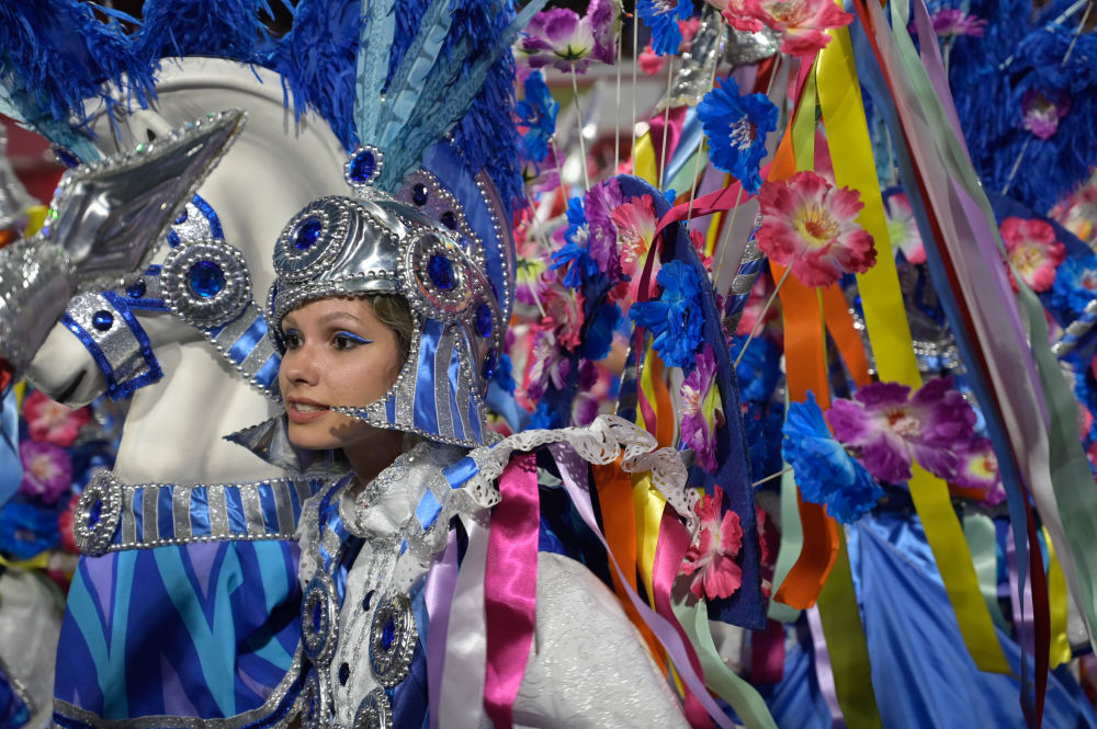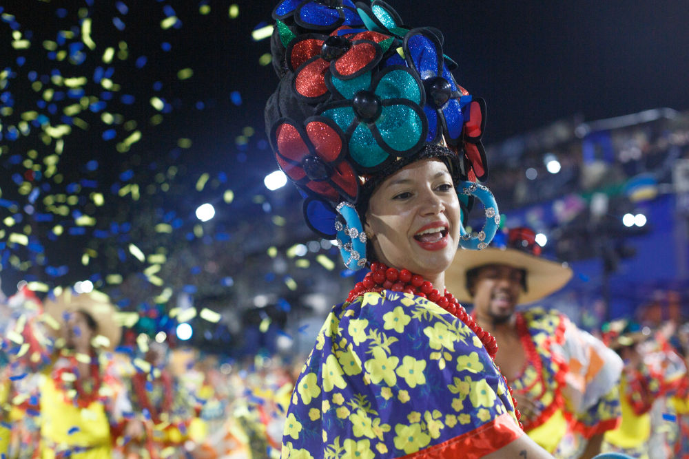 ↑2月21日凌晨,在巴西里约热内卢桑巴大道,一名桑巴舞校演员参加狂欢节游行。新华社发(克劳迪娅·马尔提尼摄)