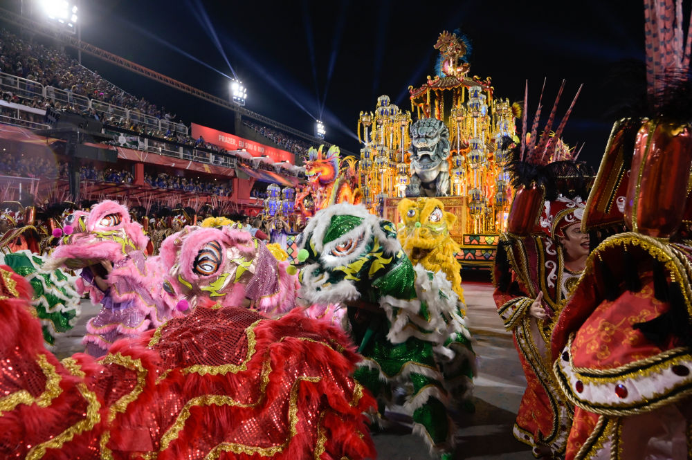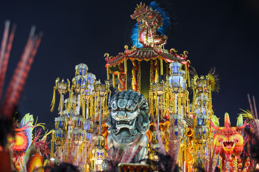 ↑2月21日凌晨,在巴西里约热内卢桑巴大道,一辆以中国文化为主题的桑巴舞校花车参加狂欢节游行。新华社发(克劳迪娅·马尔提尼摄)