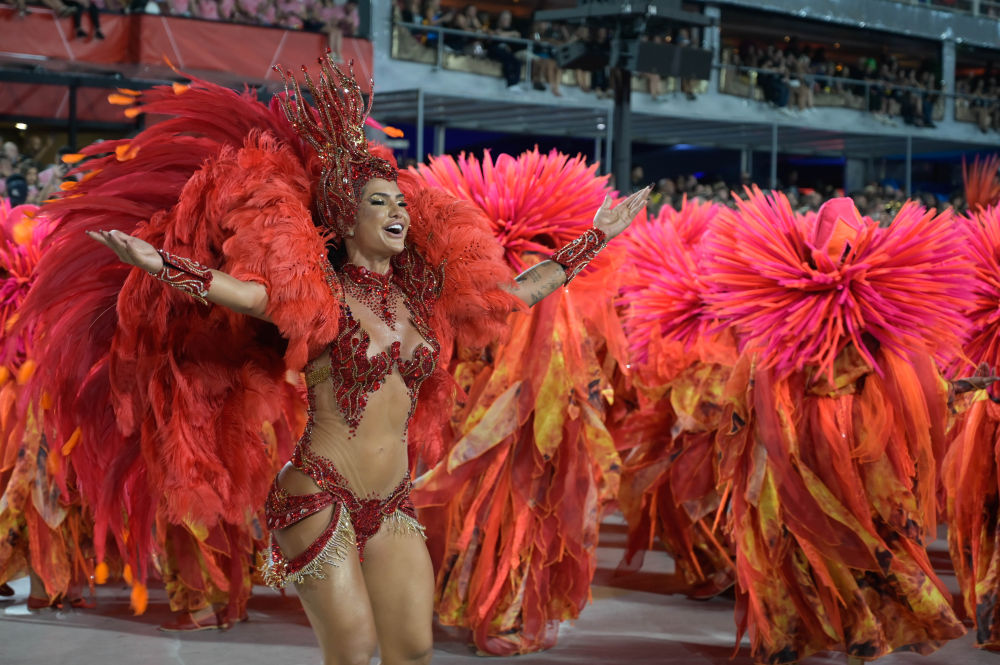 ↑2月20日晚,在巴西里约热内卢桑巴大道,一名桑巴舞校演员参加狂欢节游行。新华社发(克劳迪娅·马尔提尼摄)