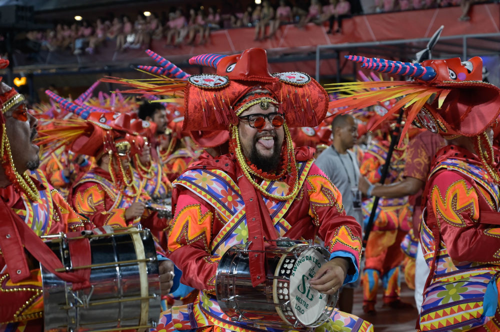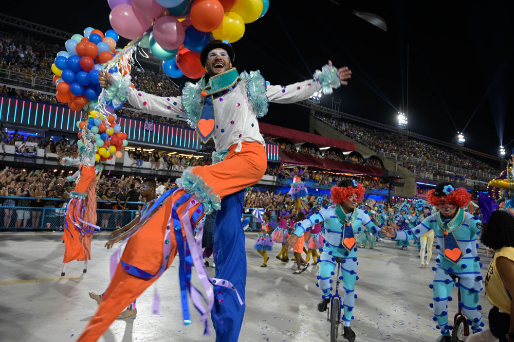 ↑2月21日凌晨,在巴西里约热内卢桑巴大道,桑巴舞校演员参加狂欢节游行。新华社发(克劳迪娅·马尔提尼摄)