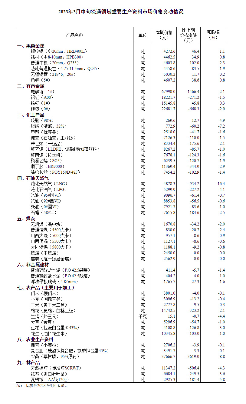 3月24日,据国家统计局,对全国流通领域9大类50种重要生产资料市场价格的监测显示,2023年3月中旬与3月上旬相比,11种产品价格上涨,37种下降,2种持平。其中,生猪(外三元)价格为15.1元/千克,下降4.4%。