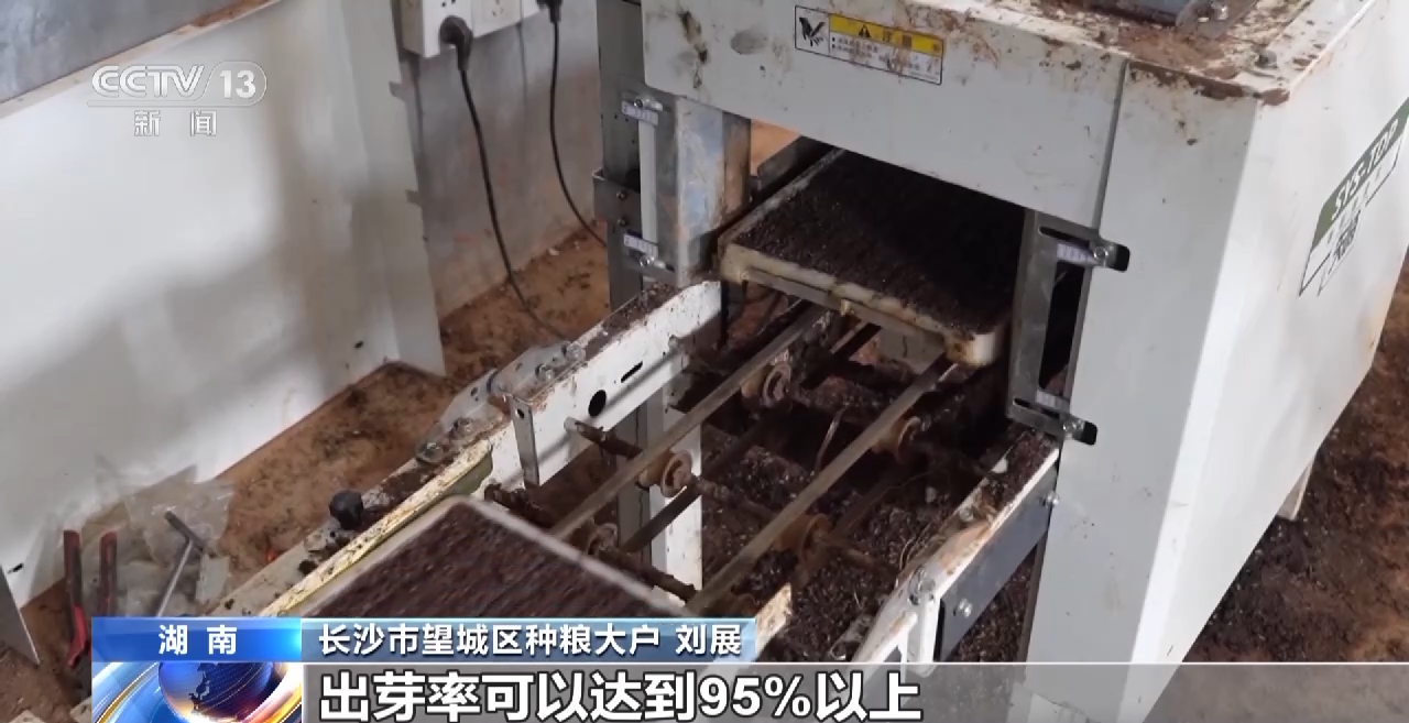 湖南省长沙市望城区种粮大户 刘展:我们现在,大概一条生产线,三个人一天可以育到一万盘秧以上,出芽率可以达到95%以上。